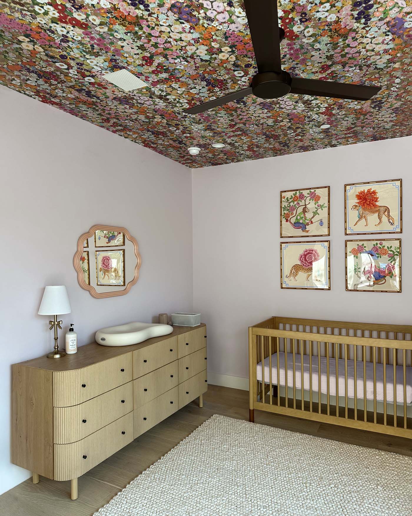 And don’t forget the ceiling! Little ones spend so much time looking up, you might consider giving them a fun pattern to look at, and then either leave the ceiling as the only wallpapered part of the room (maybe painting the walls in a coordinating color), or “drench” your whole nursery in a fabulous wallpaper, top to bottom.