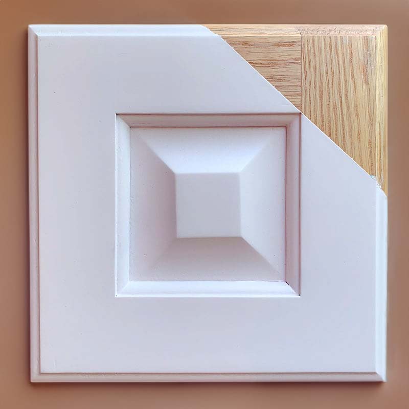 Now in both of these photos, if you zoom in, you can see tiny indentations either on the very edge of the door, or around the edge of the inset panel, where the grain wasn’t filled in 100%. This sample door is only 8 inches square, and you have to zoom in quite a bit and pay close attention to see the indentations, but they’re there. That’s what we mean by our process achieving a gorgeous result, with 95% of the grain filled in (closer to 99%, on this sample). Seen overall in a complete kitchen, the result would be beautiful, with any small areas of underlying grain barely noticeable unless someone was “looking”. We offer the option to manually fill in every last bit of grain or tiny indentation, but out of over a thousand projects we’ve done, I can count on one hand the number of times a homeowner has opted for the “Full Grain Elimination” option!